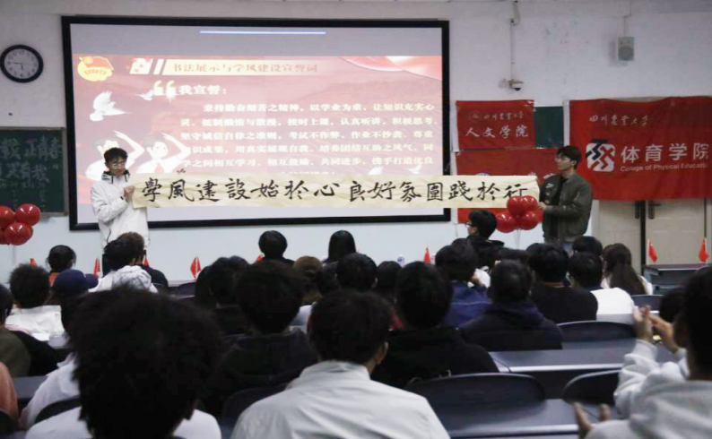 接下来,支部邀请到2023 -2024学年度“优秀员工标兵”吴侣錡分享学习经验,同时邀请书法协会为支部撰写激励学风建设的书法作品并现场展示。活动尾声,支部全体成员全体起立,庄严宣誓,为打造优良学风而努力。