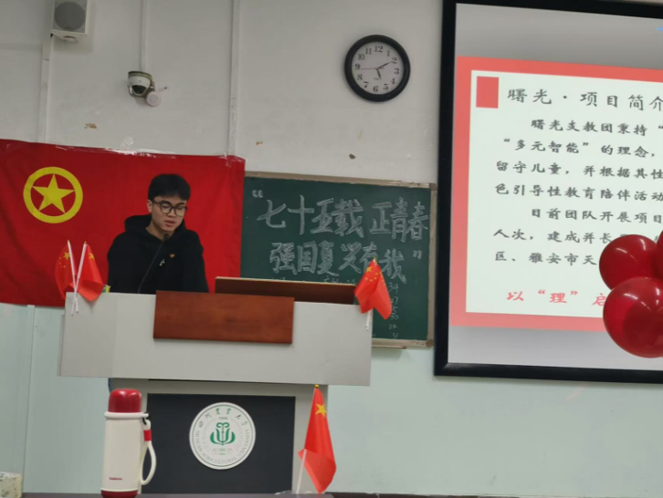 曙光支教团负责人谢晓锋为同学们分享优秀社会实践经验,将青春力量奉献祖国大地。同时,支部成员在线下进行志愿服务活动,于实践中感受青春力量。