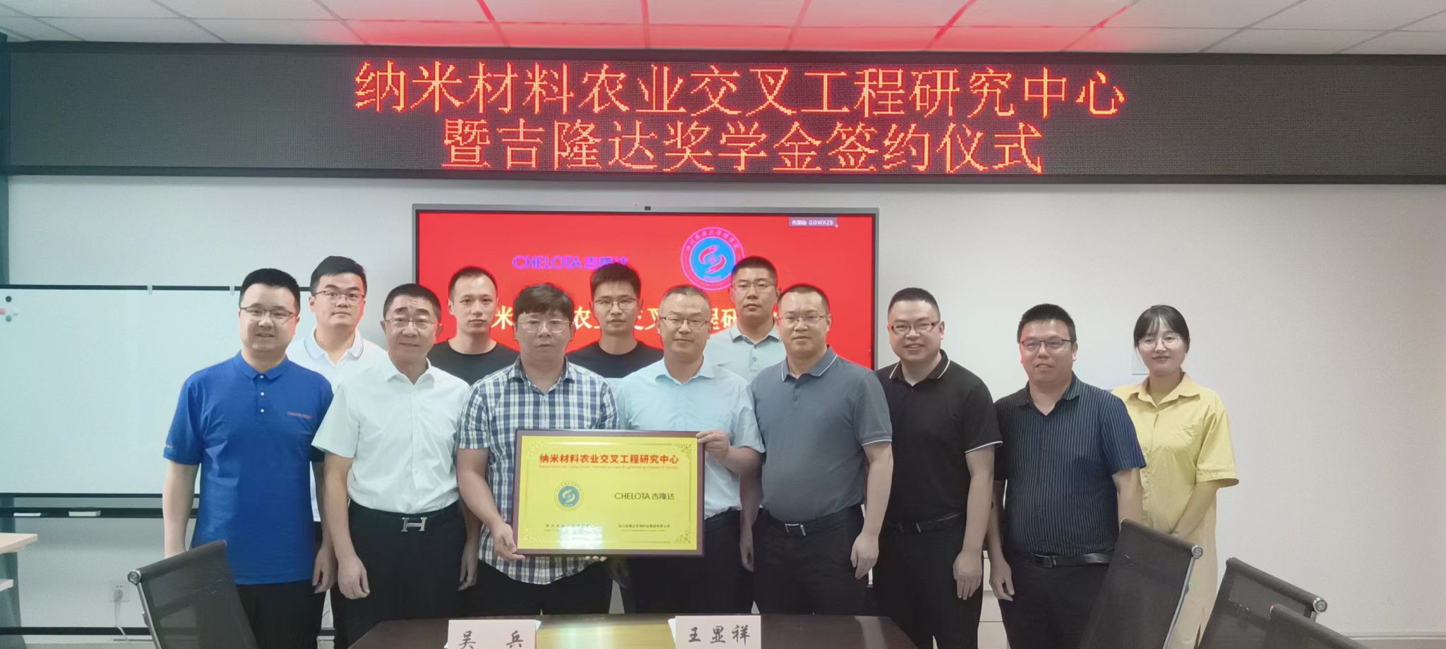 6月26日上午,公司与四川吉隆达生物科技集团有限公司联合共建“纳米材料农业交叉工程研究中心”暨吉隆达奖学金签约仪式在成都校区西康楼1203会议室举行。吉隆达公司董事长李达昌、总裁李冠良、研究院经理吴兵、知识产权主任杨小萍、研发经理万宇,公司经理饶含兵,党委书记胡永波,副经理、纪委书记鲁志伟,研究中心负责人王显祥及师生代表出席签约仪式。仪式由胡永波主持。