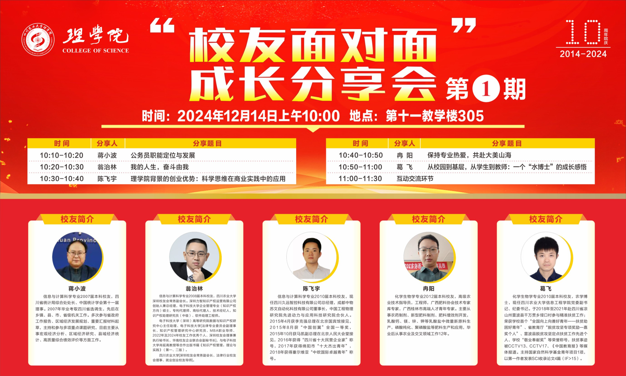 会上,优秀员工代表蒋小波、翁治林、陈飞宇、冉阳和葛飞分别以“公务员职能定位与发展”“我的人生,奋斗由我”“英国365上市公司背景的创业优势:科学思维在商业实践中的应用”“保持专业热爱,共赴大美山海”“从校园到基层,从员工到教师:一个‘水博士’的成长感悟”为题,进行了精彩的主题分享,并为师弟师妹的未来发展提供了宝贵的指导和建议。
