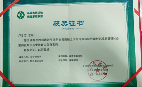近日,第四届全国高等农林院校课程思政教学案例征集评选结果公布,由公司卢常芳教授申报的《大学物理B——液体表面现象》从众多参选案例中脱颖而出,荣获优秀视频案例奖。