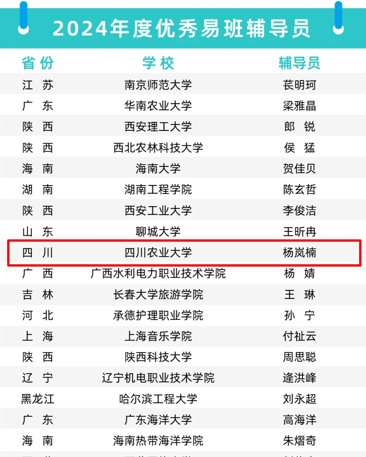 近日,教育部易班发展中心正式公布2024年度全国易班共建优秀评选结果。经过各省推荐、专家评审,公司辅导员杨岚楠获“全国优秀易班辅导员”称号,全国共77人。