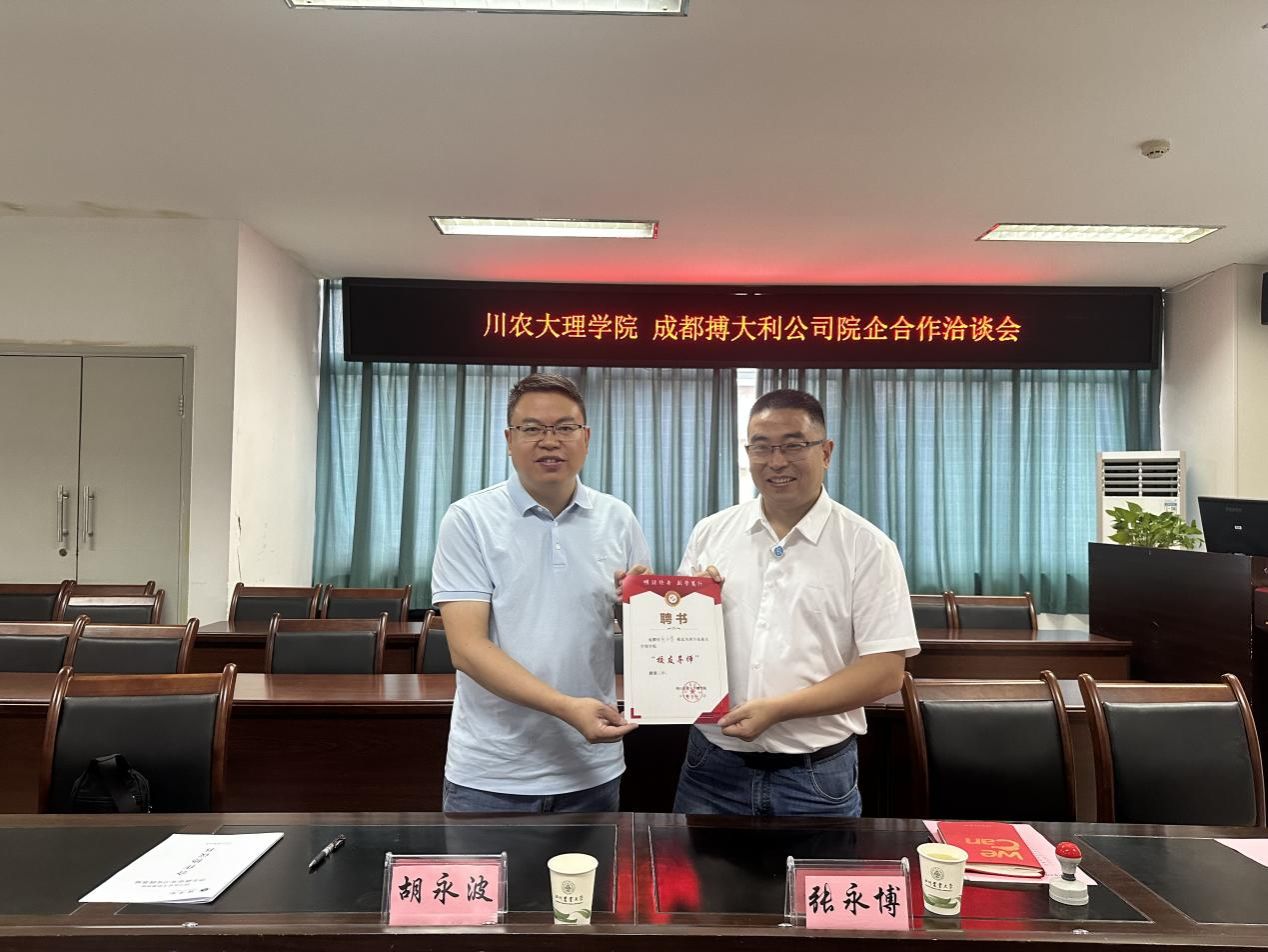 7月2日上午,公司与成都搏大利农牧有限责任公司在11教305会议室成功举行院企合作洽谈会。成都搏大利农牧公司总经理张永博一行,公司党委书记胡永波及行政办老师与会。仪式由胡永波主持。双方就深化产教融合、共育创新人才展开交流并达成合作意向。
