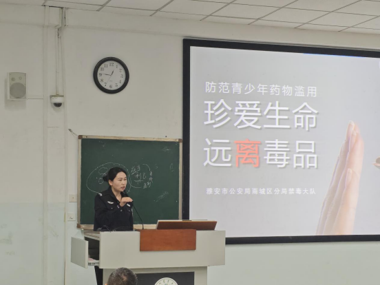 活动伊始,雅安市公安局雨城区分局禁毒大队警官以“珍爱生命,远离毒品——防范青少年药物滥用”为主题,向同学们系统普及禁毒知识。现场大屏幕上,“不擅自购药用药、不偏听偏信谎言、不结交涉毒损友、不自甘沉沦堕气”等防毒方法清晰呈现;警官结合新型毒品“伪装术”案例,如混入电子烟油的依托咪酯、包装成“奶茶粉”的合成大麻素等,揭露其“娱乐无害”的虚假面纱,让同学们对毒品的隐蔽性与危害性有了直观认知。