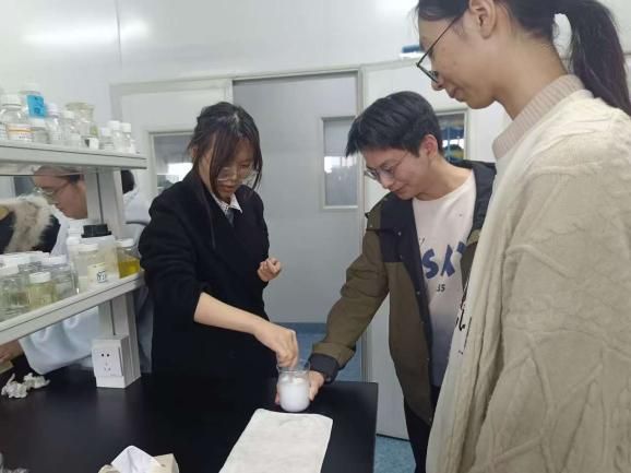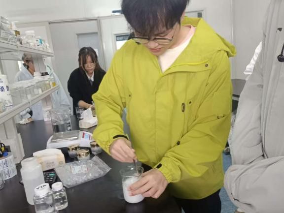 下午,在高级工程师陈玉的指导下,同学们分组协作制作面霜。同学们认真专注,按照比例加入原料、混合搅拌、规范灌装成型,深度参与化妆品生产的制作过程,将课堂上习得的乳化、分散等化学原理转化为亲手操作的实践能力。一小时的实验过程中,大家分工明确、互帮互助,记录制作过程,在交流探讨中深化知识理解,当亲手制作的手霜顺利成型时,每个人的脸上都洋溢着满满的成就感与获得感。