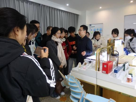 在晟氏集团乐山工厂大厅,企业销售总监杨坤林详细介绍了晟氏集团的产业布局及乐山工厂的核心业务与技术优势,让同学们对企业的生产运营体系有了初步了解。随后,参与师生分两组有序深入工厂生产线参观:从严格管控的多肽车间到专注研发的化妆品生产线,再到展示企业成果的展厅、检验产品质量的理化实验室,同学们驻足观察、认真记录,眼神中满是对专业应用的好奇与探索欲。
