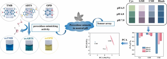 研究发现,RuPDA与生物硫醇分子之间通过硫钌键发生特异性相互作用。基于其催化活性对pH的敏感性,利用单一RuPDA纳米酶,通过调节三个相近中性pH值下的催化响应作为传感通道,构建了一套无需多探针的简单比色传感阵列。该阵列对不同生物硫醇产生特征性颜色响应,可实现对半胱氨酸、谷胱甘肽与同型半胱氨酸的区分与定量检测,检测限达微摩尔级,并能在血清样本中实现准确识别。该方法突破了传统传感器依赖多种纳米酶或酸性条件的限制,为发展适用于生理环境的中性活性纳米酶提供了新思路,同时展示了一种简便、低成本、可视化的多目标物识别平台,在疾病诊断、生物监测等领域具有良好应用潜力。