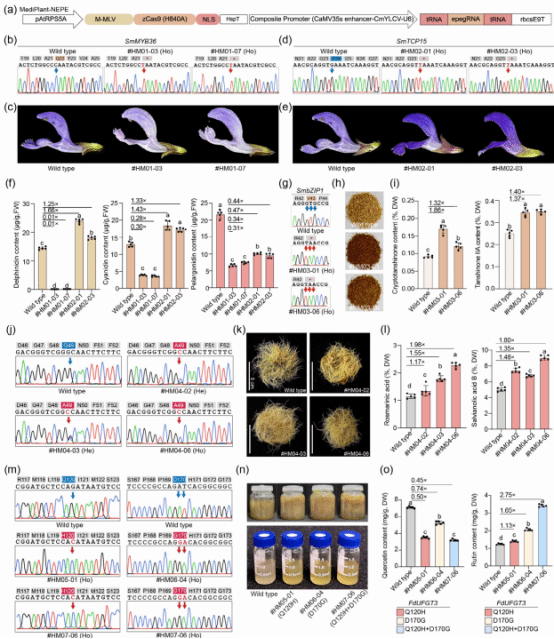 本研究在前期植物引导编辑技术基础上,对 Cas9 nickase 与 M-MLV 逆转录酶的融合方式及表达系统进行了针对性优化,使该编辑器能够高效适配药用植物复杂的遗传背景。在多个靶基因位点上,MediPlant-NEPE 实现了 20%–40% 的编辑效率,并成功获得稳定的双等位突变体,显示出良好的通用性和可靠性。(1)表型性状改良方面:对SmMYB36和SmTCP15进行了精准碱基替换,引入提前终止密码子,从而精细调控花青素合成通路,创制了紫色梯度渐变的丹参新材料;(2)合成生物学应用方面:通过精准编辑调控因子SmbZIP1,显著提高了丹参根中丹参酮类化合物的积累,其中丹参酮IIA含量提升达1.40倍。通过对SmRAS基因的单碱基替换造成氨基酸的精确转变(G49A),成功增强酶催效率,使迷迭香酸和丹酚酸B含量最高提升近2倍;(3)分子育种应用方面:通过对金荞中芦丁生物合成关键酶FdUFGT3进行双位点精准编辑(Q120H和D170G),将自然群体中两个独立的优异单倍型聚合到同一遗传背景,实现芦丁含量2.75倍的显著提升。