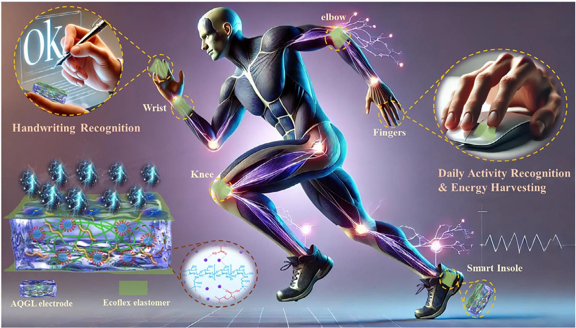 该团队通过甘油/水分子簇作为动态润滑剂,巧妙调控疏水聚合聚丙烯酸/壳聚糖季铵盐/氯化锂(HAPAA/QCS/LiCl)凝胶网络中的聚合物相互作用与交联结构。这一创新设计让 AQGL 有机水凝胶展现出惊人的力学性能:拉伸率高达5800%,杨氏模量低至14.3 kPa,韧性达11.77 MJ/m³,断裂能更是高达75.96 kJ/m²,远超多数生物组织,完美模拟了人体皮肤的柔顺性与坚韧性。除了卓越的力学性能,AQGL 还集成了多重实用功能:可见光范围内透明度约 95%,在 - 40℃低温下仍能保持柔性且具备抗结冰能力,100 天常温存储后仍能保留 92% 的初始重量,同时拥有优异的抗菌性、导电性和自修复能力,对金黄色葡萄球菌和大肠杆菌的抗菌率均达 99.9999%。基于该水凝胶制备的摩擦纳米发电机(AQGL-TENG),峰值功率密度达 0.92 W/m²,开路电压 352 V,短路电流 4.5 μA,可高效收集机械能并转化为电能,轻松驱动 80 盏 LED 灯或商用温湿度计。其在运动监测、手写识别、自主能量收集等场景中表现出稳定可靠的性能,可贴合人体皮肤或集成于鞋垫、键盘等设备,精准捕捉步态、关节活动、按键动作等信号。这项研究不仅通过分子链润滑策略打破了刚度与韧性的固有矛盾,更构建了一种多功能兼容的软韧有机水凝胶平台。该材料在柔性传感器、人机交互、医疗健康监测等领域具有广阔应用前景,将有力推动下一代自供能可穿戴电子技术的革新与落地。