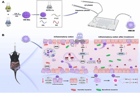 炎症性肠病(IBD)是困扰全球超 680 万人的慢性疾病,患者常伴随腹痛、腹泻、便血等症状,严重影响生活质量。目前口服抗炎药物是该疾病的一线治疗方案,但临床应用中仍面临诸多难题,如药物靶向性差、生物利用度低,且难以有效清除肠道内过量的活性氧(ROS),治疗效果受限。针对这一临床痛点,研究团队创新地将 Cu-Mn₃O₄纳米酶(CM NZs)封装于藻酸钙水凝胶微球(HM)中,构建出具有结肠靶向特性的纳米酶水凝胶微球复合材料 HMCM,专门用于炎症性肠病的口服靶向治疗。