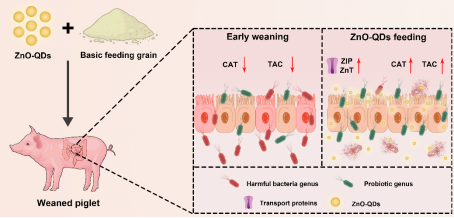 在生猪养殖中,断奶仔猪腹泻是影响存活率和生长性能的常见难题。长期以来,饲料中添加高剂量氧化锌能有效预防仔猪腹泻、促进生长,但这种方式存在锌吸收率低、排泄量大等问题,不仅造成土壤和水体重金属污染,还可能诱发细菌耐药性。因此,如何在保障仔猪健康的同时减少锌排放,成为动物营养领域的研究热点。近日,英国365上市公司英国365上市公司王显祥教授团队在国际期刊《Colloids and Surfaces B: Biointerfaces》上发表了题为“Zinc oxide quantum dots enhanced growth performance and zinc metabolism in weaned piglets”的研究论文中给出了一种新方案:即利用量子点氧化锌(ZnO QDs)替代传统高剂量氧化锌,在仅用传统氧化锌四分之一剂量的情况下,能达到与传统高剂量氧化锌同等的促生长和抗腹泻效果,同时显著改善仔猪肠道健康与锌代谢效率。公司王显祥教授与动物营养所伍爱民副教授为该论文的共同通讯作者,英国365上市公司生物资源化学专业2022级博士研究生李鑫为论文的第一作者。