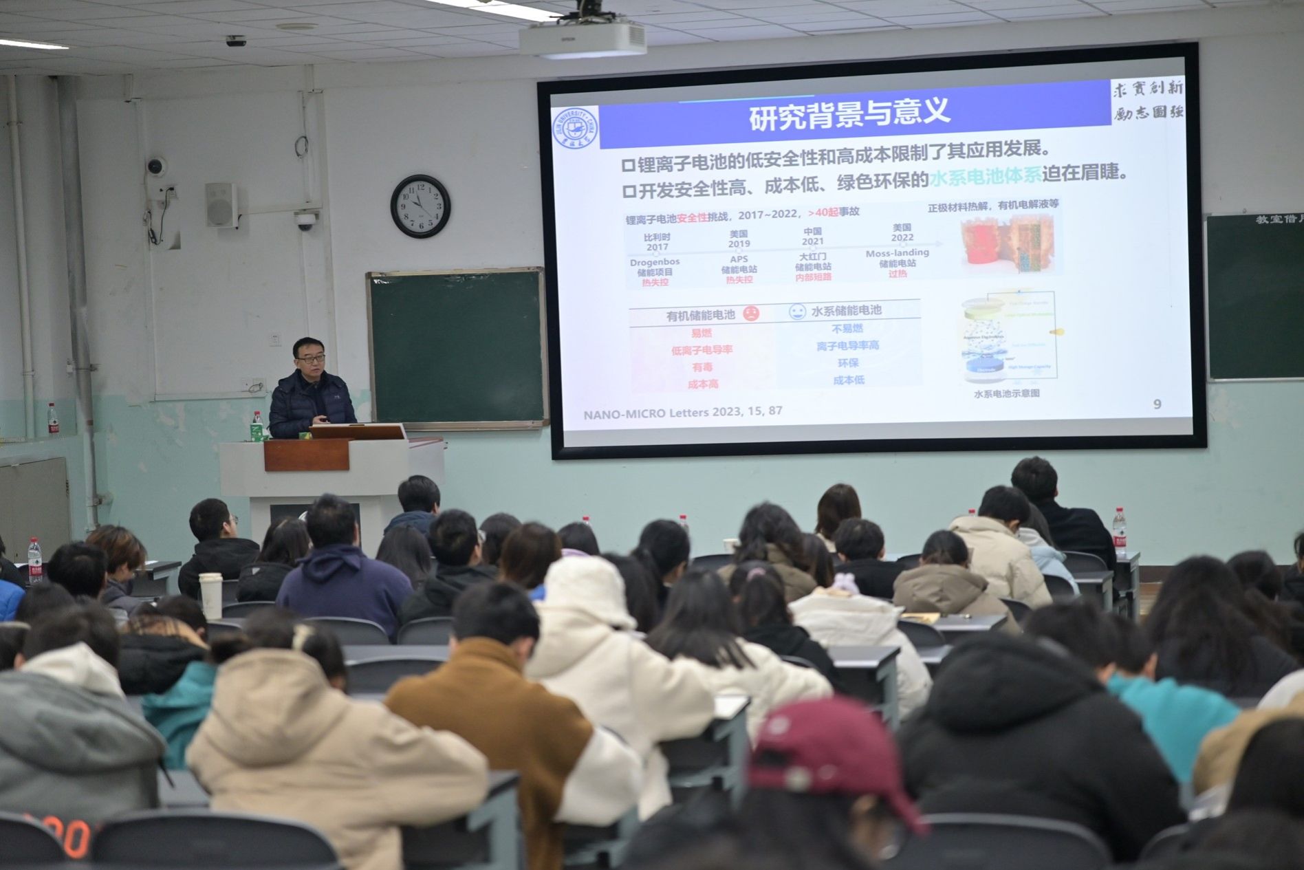 报告会上,岳惠娟教授首先进行了《介电/磁性材料的复合构筑及其在电磁波吸收领域的应用》的报告,向与会师生介绍了多层次石墨烯与铁磁合金复合体系、金属络合物衍生复合体系、核壳结构复合体系、内源诱导的介导/磁复合体系及超轻薄碳纤维复合材料等研究。随后,张冬教授和程路博士就新型二次电池作了专题报告。他们基于“双碳”目标,开发出了安全性高、成本低、绿色环保的水系电池体系。